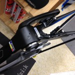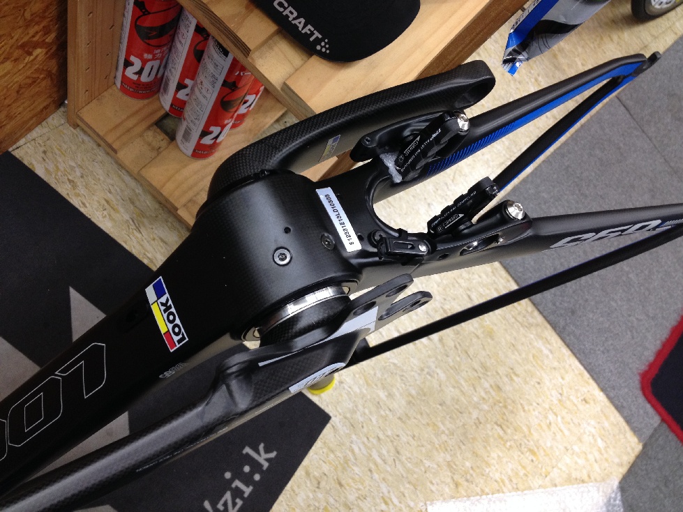 フロントブレーキワイヤーはステムとフォークコラムを通して内蔵し、フォークをくり抜く形で設置したミニVブレーキタイプのキャリパーに接続する驚きのシステムです。リアブレーキもチェーンステー下に設置し、空気抵抗の軽減だけでなくビジュアル的にも美しくすっきりと仕上がっています。