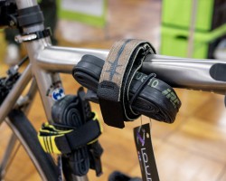 自転車にはベルクロストラップ、携行品はゴムストラップで固定します。
