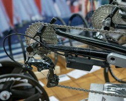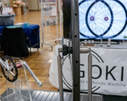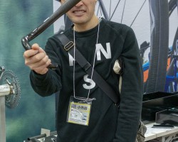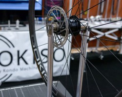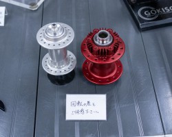 ディスクブレーキ用のプロトタイプ。通常モデルよりベアリングが大きくなり、回転抵抗も大きくなってしまうようで、その辺が課題とのことでした。