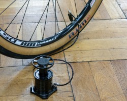 ハンドポンプの3倍早く空気が入れられるというふれ込みのフットポンプ。