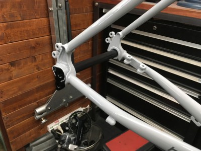 Sサイズでフレーム重量約2.4Kgと決して軽量ではありませんが、チェーンサックを防ぐために右チェーンステーを大胆に板状にするなど実用重視の面白い設計になっています。