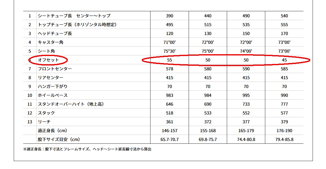これはRL3のジオメトリー(フレームの設計数値)なのですが、赤丸を付けたオフセットという数字に注目して下さい。これはフロントフォークの曲がり具合を示しており、ハンドリングの性能を決める上で非常に重要な数値になります。本来はキャスター角(ヘッドアングル)と連動して変えたほうがハンドリングが素直になるのですが、多くのメーカーはコストダウンのために(フロントフォークの種類を増やしたくないので)1種類か多くても2種類しか用意していないのに、RL3はサイズ展開が4つしかないのにわざわざ3種類もオフセットの違うフォークを用意して、ハンドリングの素直さを追求しているのです!!