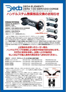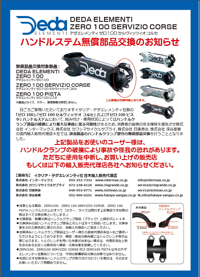 イタリア・デダエレメンティ社製の「ゼロ100」「ゼロ100セルヴィッツオ コルセ」 および「ゼロ100ピスタ」ハンドルステムにおいて、組み付け・使用状況によってはハンドルクランプ部品の破損により重大な事故に至る可能性がある事がわかりました。