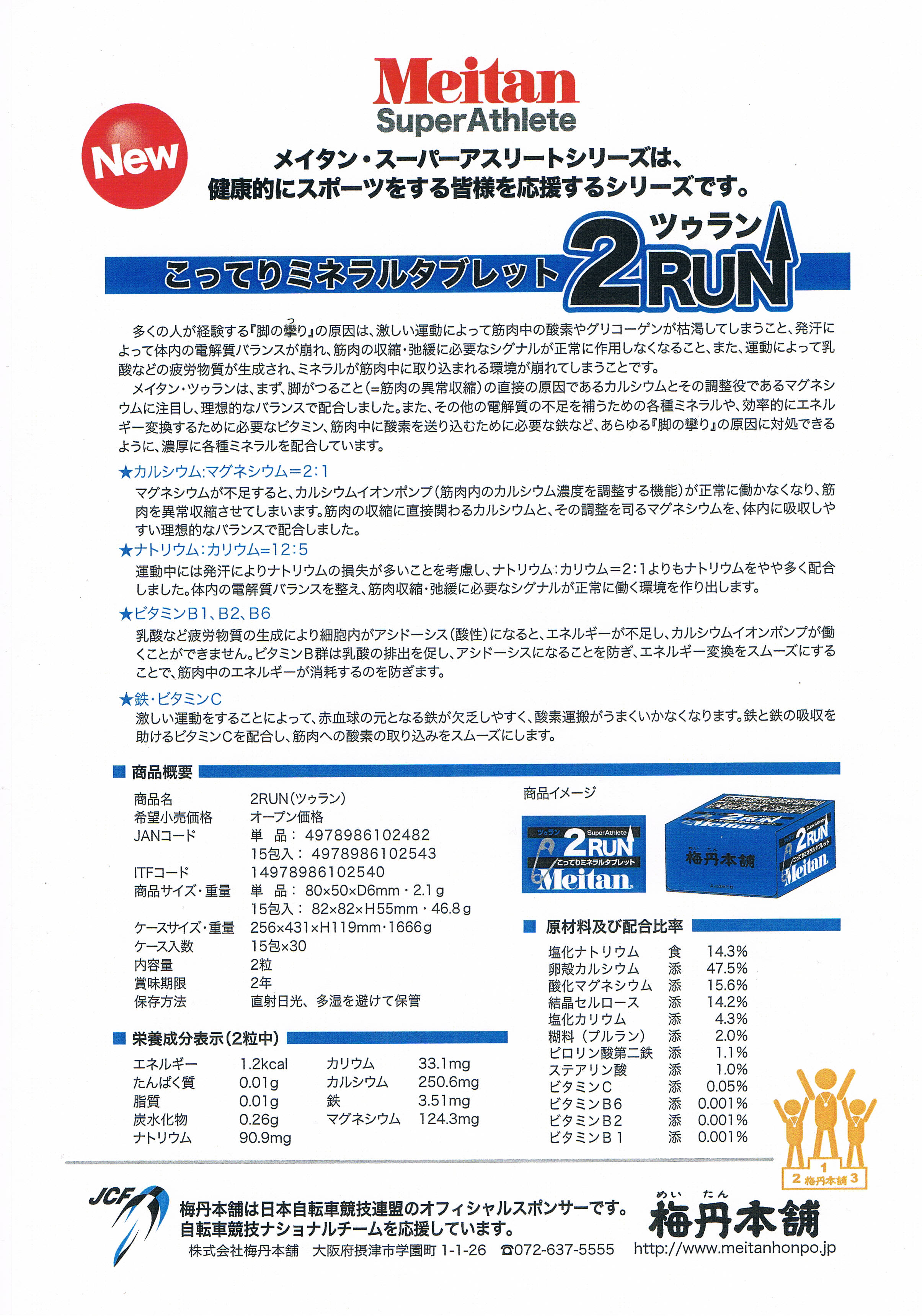 入荷情報《入荷情報》梅丹本舗,パナレーサー Posted on 2013年4月19日 by cyclecube ■梅丹本舗 ・こってりミネラルタブレット 2RUN(ツゥラン) 運動中の筋肉の痙攣のメカニズムに注目し開発したタブレット。 カルシウム、マグネシウム、ナトリウム、カリウム、鉄分、ビタミンB群をバランスよく配合し、痙攣を予防、ストップします。 CYCLECUBE価格:160円 ■パナレーサー ・RACE type L(ライト)Evo2 マイナーチェンジのEVO2、軽量バージョンも入荷しました。 CYCLECUBE価格:4,280円(20%OFF) cyclecube 《お知らせ》ANCHOR RL8試乗車【終了しました】 《入荷情報》WEI JIA