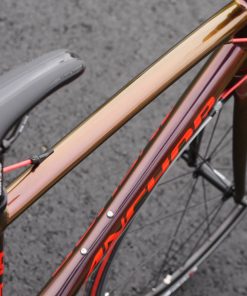 湾曲するシートステー、丸パイプのダウンチューブがBB付近で扁平に変化するなど、非常に凝った形状のアルミフレームです。