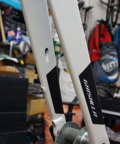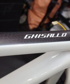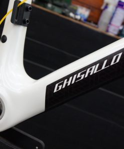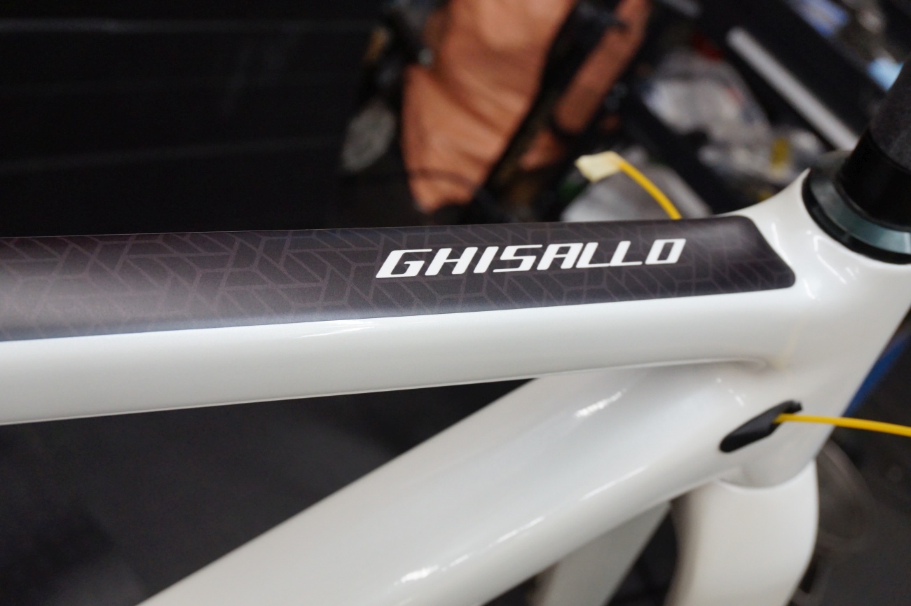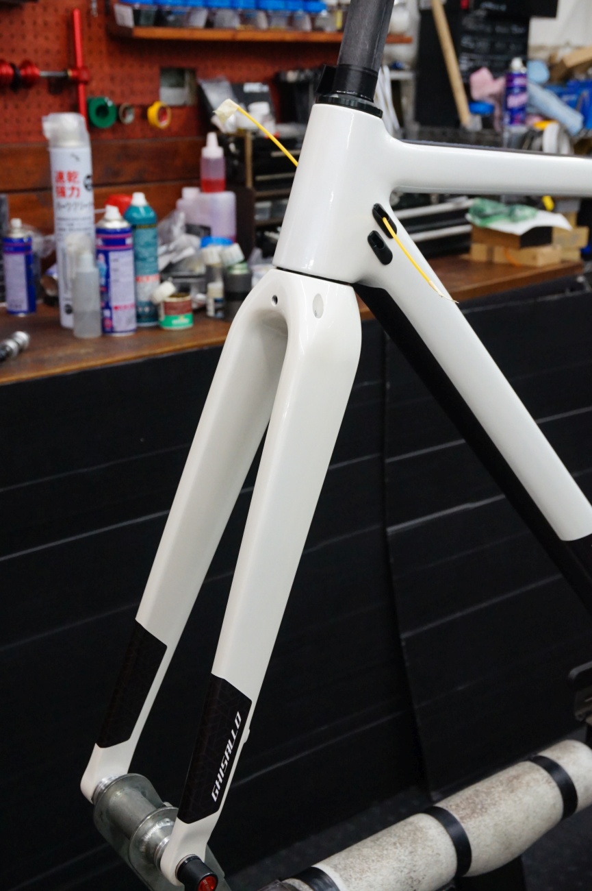 トップチューブ・ダウンチューブ・フロントフォークに貼られたフレームデカールは、保護フイルムも兼ねており、ギザッロ教会の石畳をイメージしたグラフィックになっています。