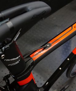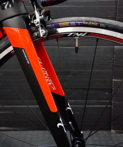 マットブラック×グロスレッドの迫力あるカラーリングとエアロ形状のレーシングバイクです。せっかくなのでホイールも新調ということで、TNI AL22Wアルミリム+TNI Six60ハブ+SAPIM CX-RAYで前後1500gという軽量手組ホイールをチョイス。