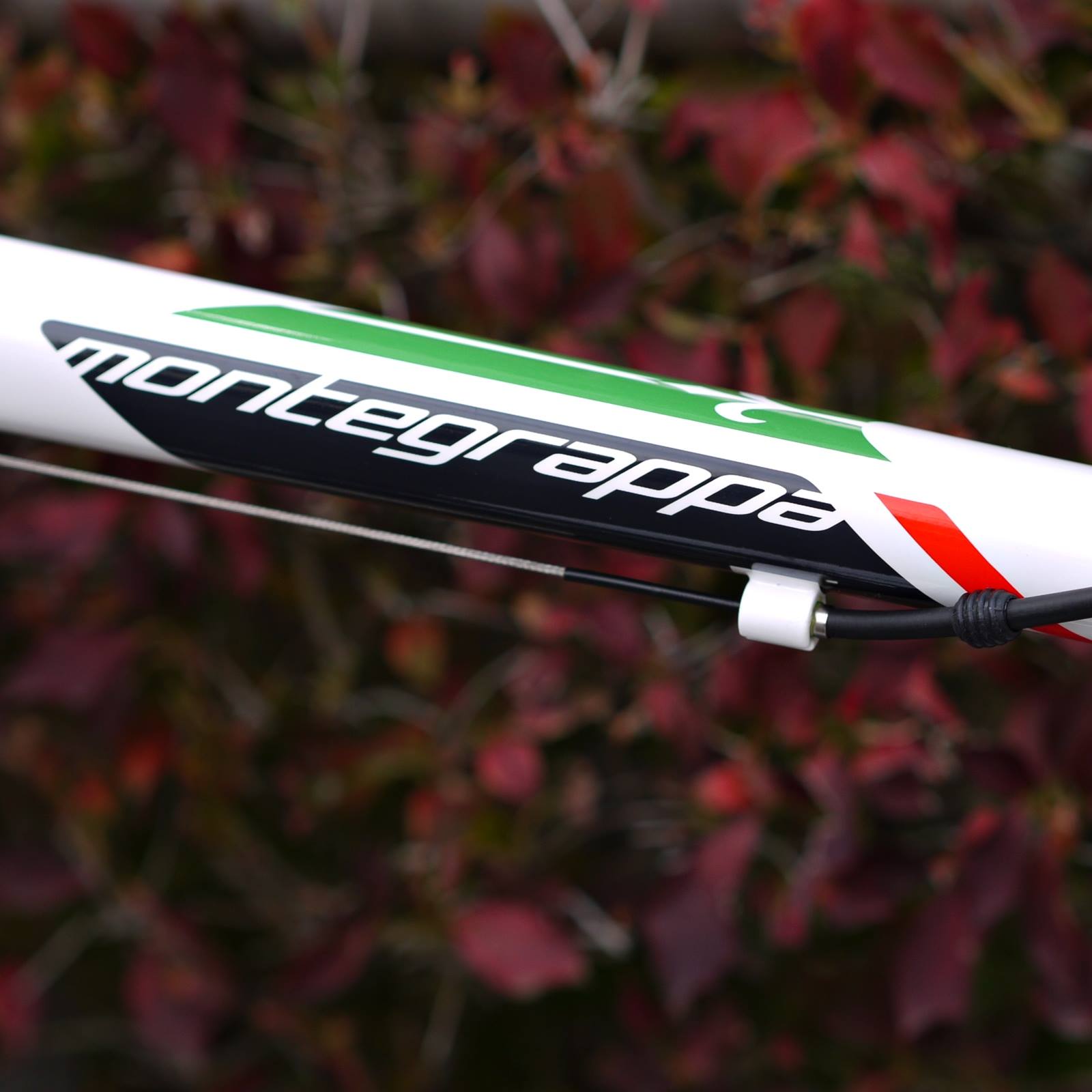 ホワイトをベースにグレー、レッド、そしてトップチューブにはイタリア国旗をモチーフにグリーンが加えられた爽やかな配色のバイクです。