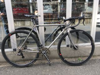 塗装や修理で色々とお世話になっているTSURUOKA RACINGさんでは、新開発のクロモリディスクロードを試乗させてもらいました!なんとフォークも1インチコラムのクロモリフォークで、フラットマウント台座が直付けされています。
