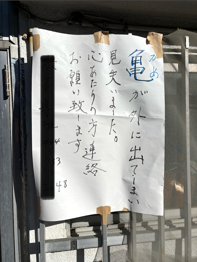 日記 通勤途中に tabira 2026年2月1日 0 Comments 朝、お店に向かっていると、いつも前を通る家に次のような張り紙が貼ってありました。 亀が脱走したとのこと。 お店までの道のりを注意深く見たのですが亀は、見かけませんでした。 お店の前に「自転車ナビマーク」がペイントされていました。 自転車の安全な通行を促す目的で設置されている法定外の道路標示のようですが 精神的に安心感がありますね。