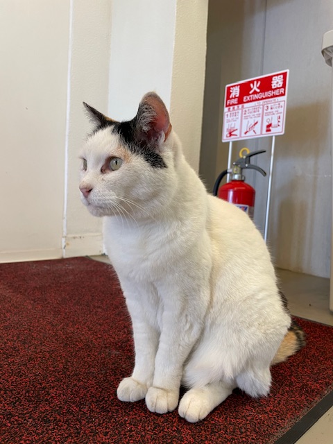 建物の中に堂々と座り、凛々しい顔つきで出入りする人をチェックしています。