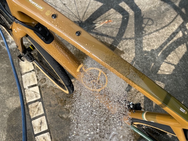 走っているうちにトップチューブなどに汗が落ちているので帰宅すると軽く水をかけて拭き取ります。